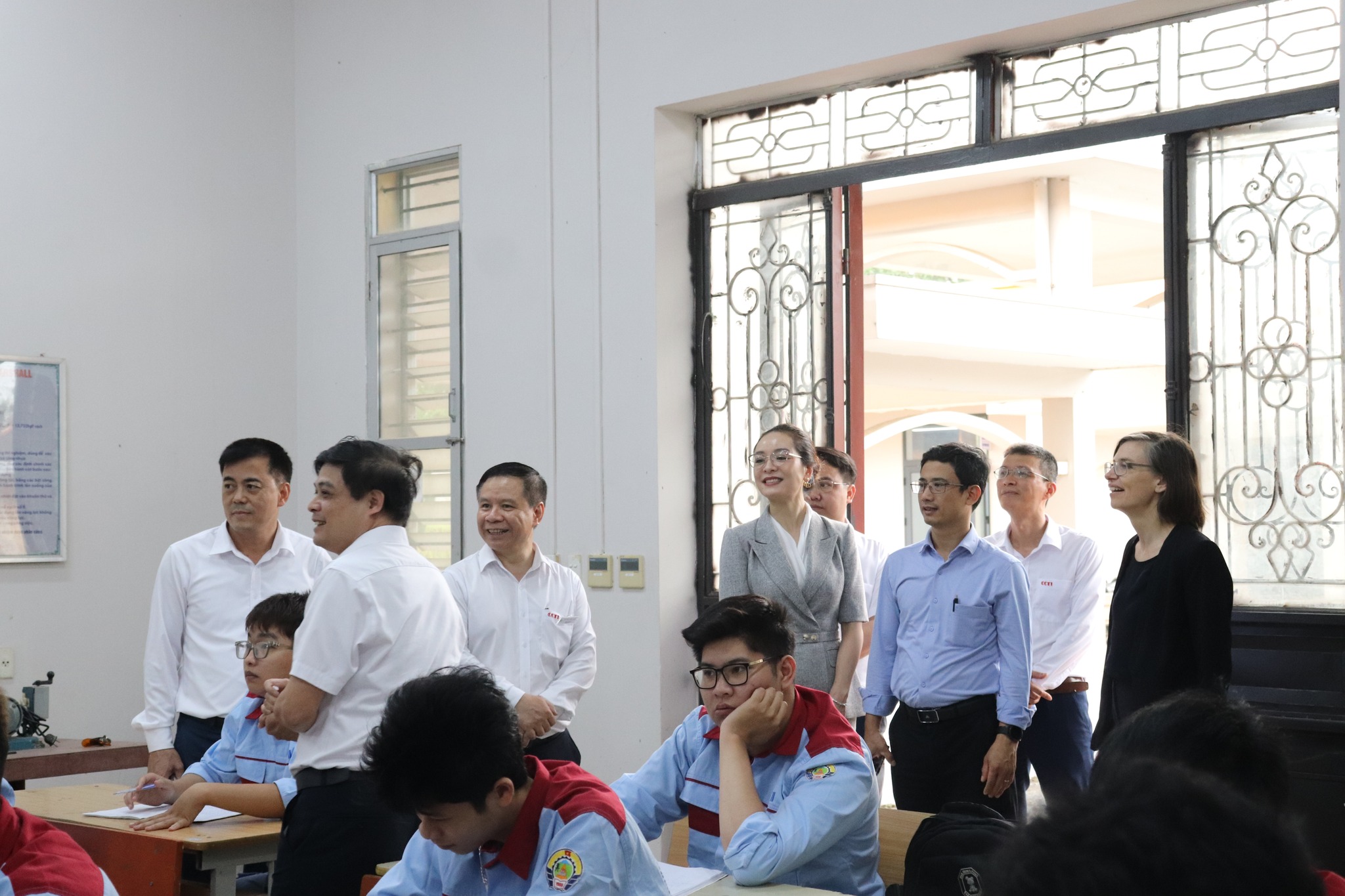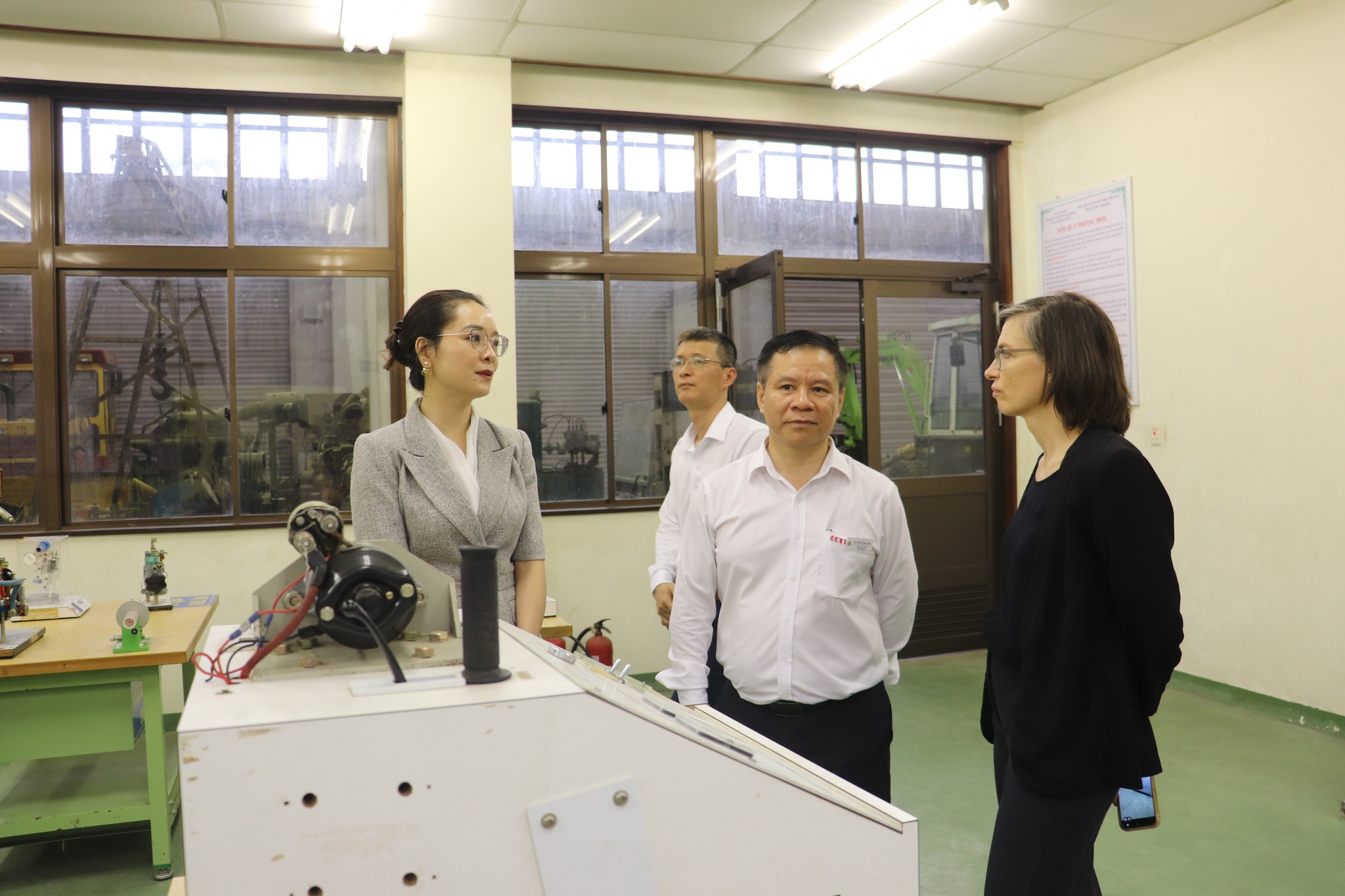 Trong khuôn khổ chương trình, đoàn công tác đã trực tiếp tham quan hệ thống cơ sở vật chất của nhà trường, bao gồm phòng học lý thuyết, xưởng thực hành và các khu chức năng phục vụ đào tạo.