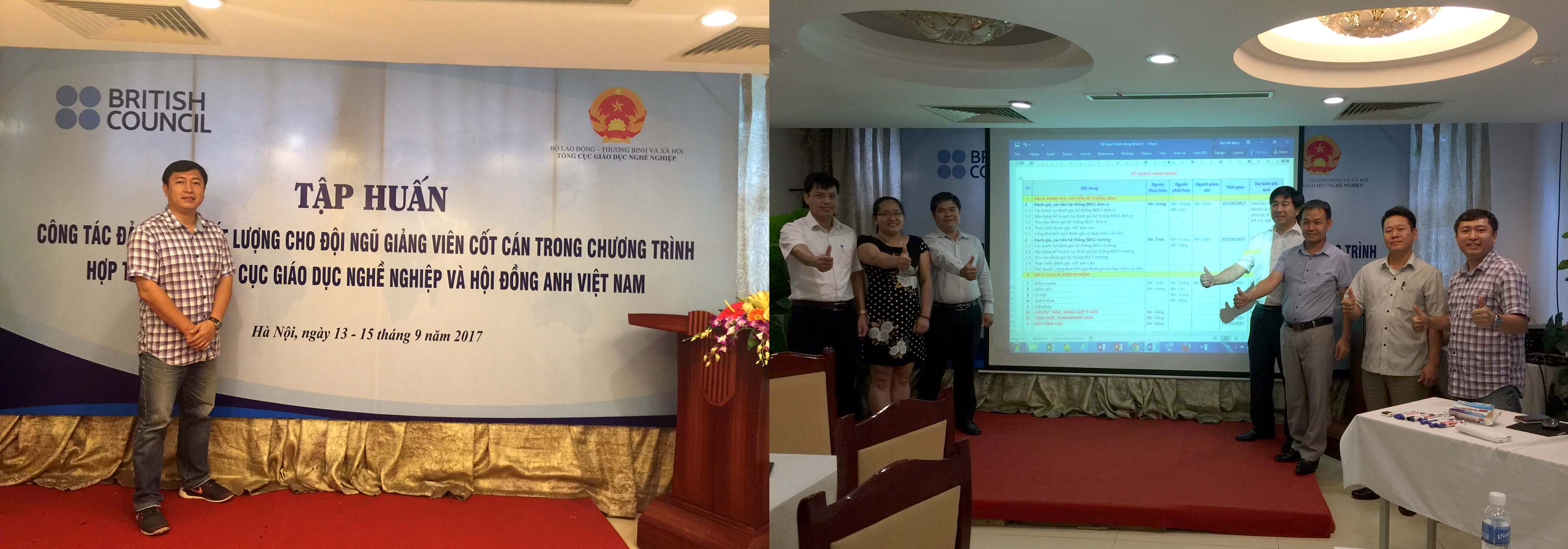 Trong thời gian từ ngày 13 đến ngày 15/9/2017, tại Hà Nội, Cục Kiểm định chất lượng giáo dục nghề nghiệp - Tổng cục Giáo dục nghề nghiệp đã phối hợp với Hội đồng Anh Việt Nam tổ chức khóa tập huấn công tác đảm bảo chất lượng cho đội ngũ giảng viên cốt cán trong chương trình hợp tác giữa Tổng cục Giáo dục nghề nghiệp và Hội đồng Anh Việt Nam.