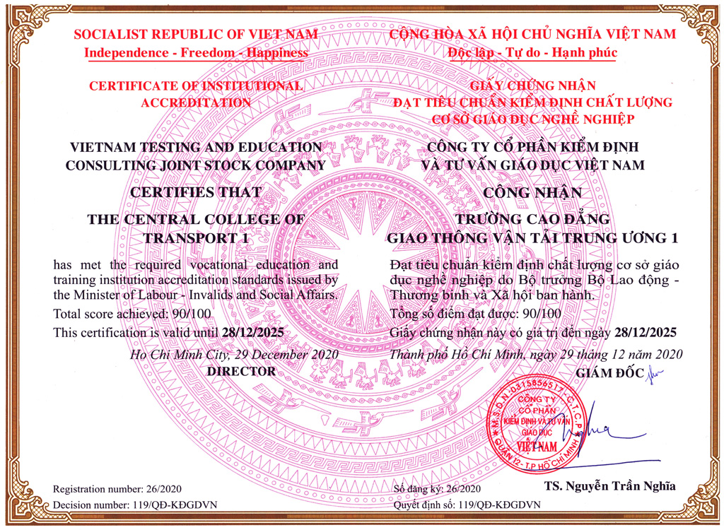 Giấy chứng nhận số 119/QĐ-KĐGDVN ngày 29/12/2020 của Công ty Cổ phần Kiểm định và Tư vấn giáo dục Việt Nam công nhận đạt chuẩn kiểm định chất lượng cơ sở GDNN do Bộ trưởng Bộ LĐTBXH ban hành cho Trường Cao đẳng GTVT Trung ương I.