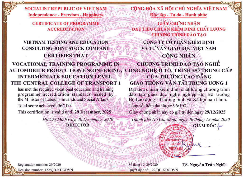 Giấy chứng nhận số 122/QĐ-KĐGDVN ngày 30/12/2020 của Công ty Cổ phần Kiểm định và Tư vấn giáo dục Việt Nam công nhận đạt tiêu chuẩn kiểm định chất lượng chương trình đào tạo GDNN do Bộ trưởng Bộ LĐTBXH ban hành cho Trường Cao đẳng GTVT Trung ương I