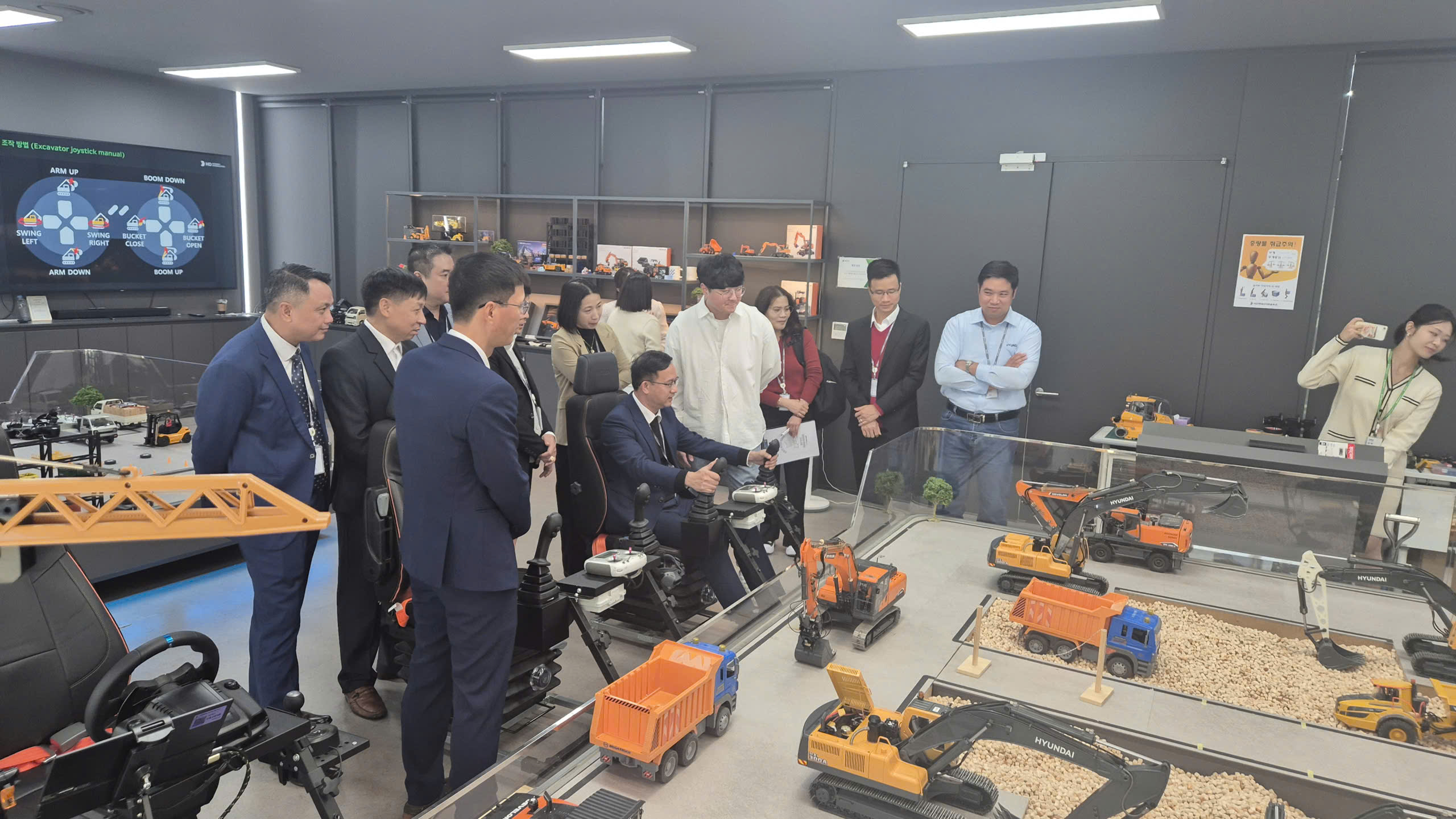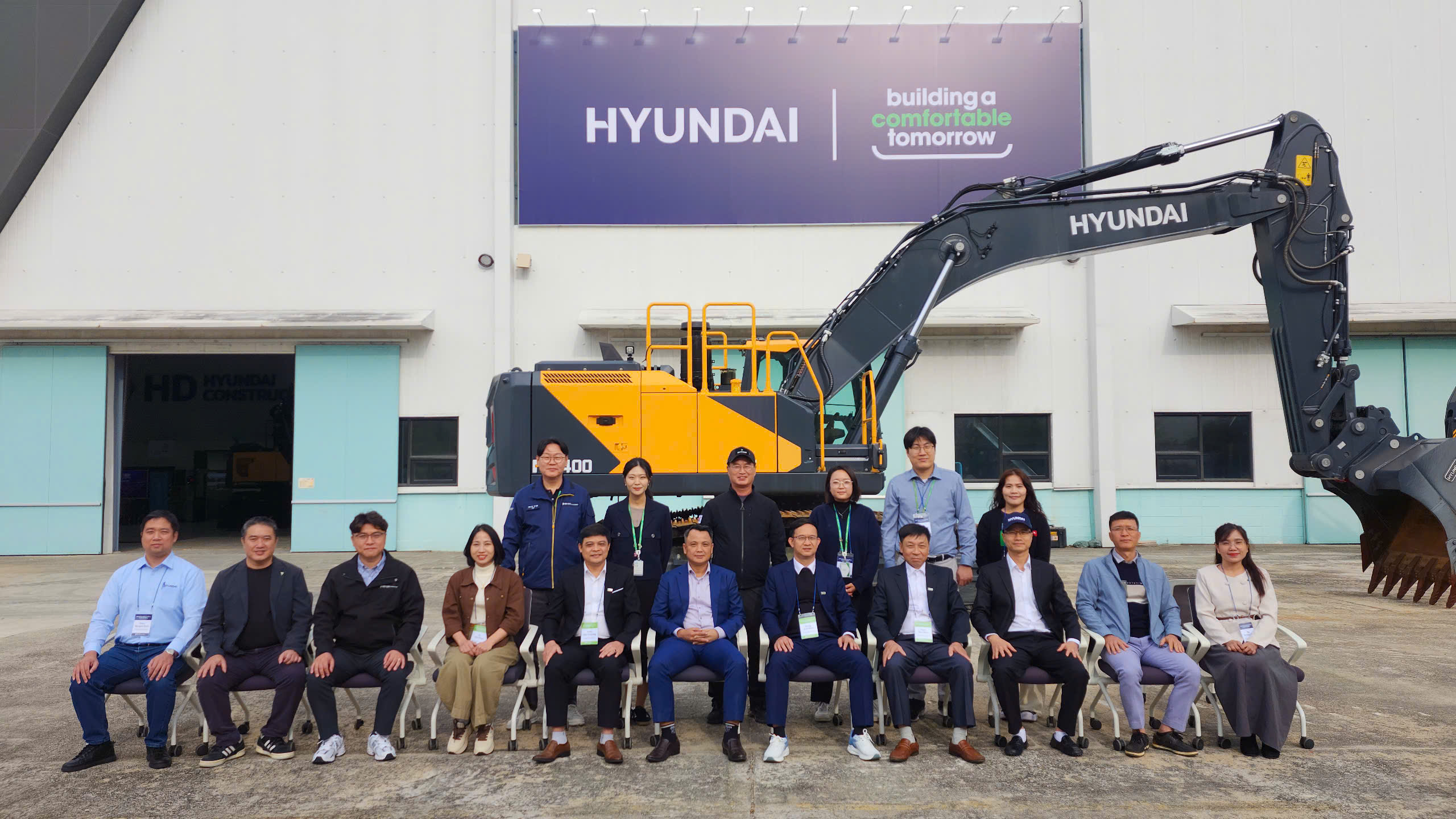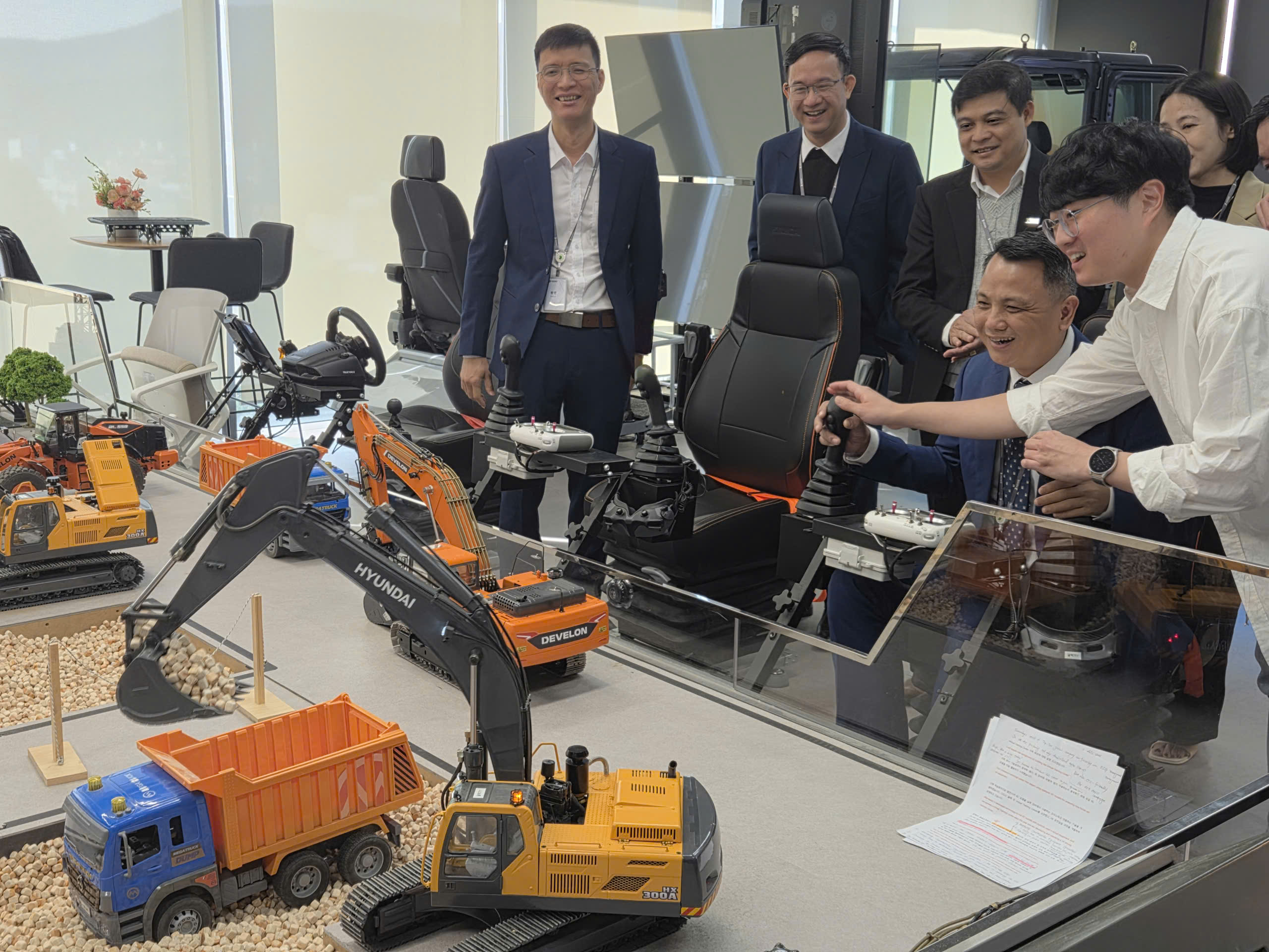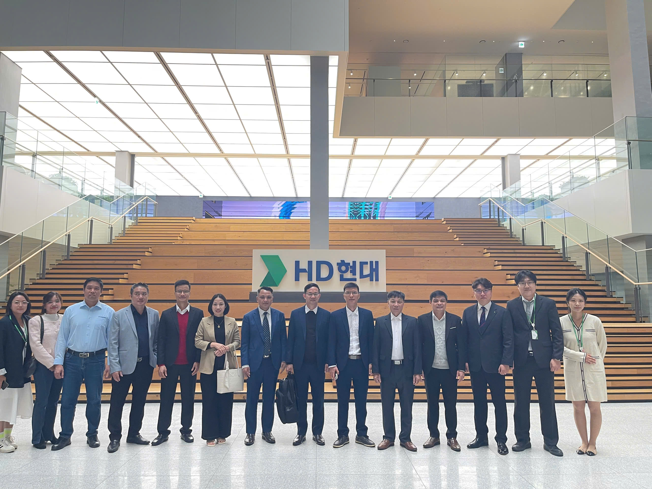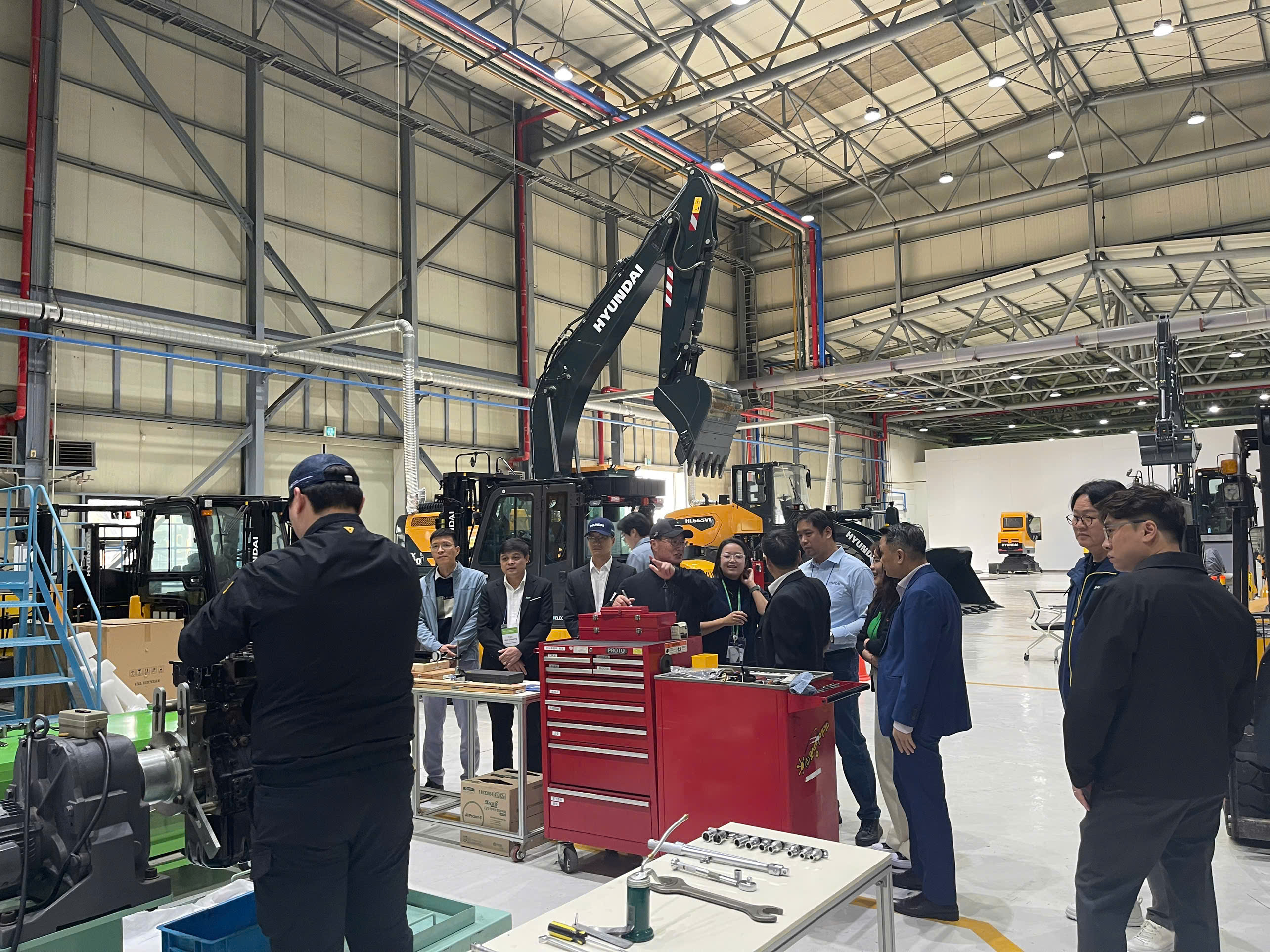 - Tham quan và làm việc trực tiếp tại trụ sở chính, các nhà máy sản xuất và Trung tâm Đào tạo Toàn cầu (GTC) của Hyundai. Tại đây, đoàn được tận mắt chứng kiến dây chuyền sản xuất thiết bị xây dựng hiện đại bậc nhất, nơi những cỗ máy xúc, máy ủi được lắp ráp chính xác bởi robot và bàn tay của những kỹ sư lành nghề. Đặc biệt, mô hình đào tạo nhân lực kỹ thuật cao được tích hợp ngay tại nhà máy và trung tâm GTC đã cho thấy sự gắn kết chặt chẽ giữa lý thuyết và thực tiễn, đáp ứng nhu cầu của doanh nghiệp và khách hàng.