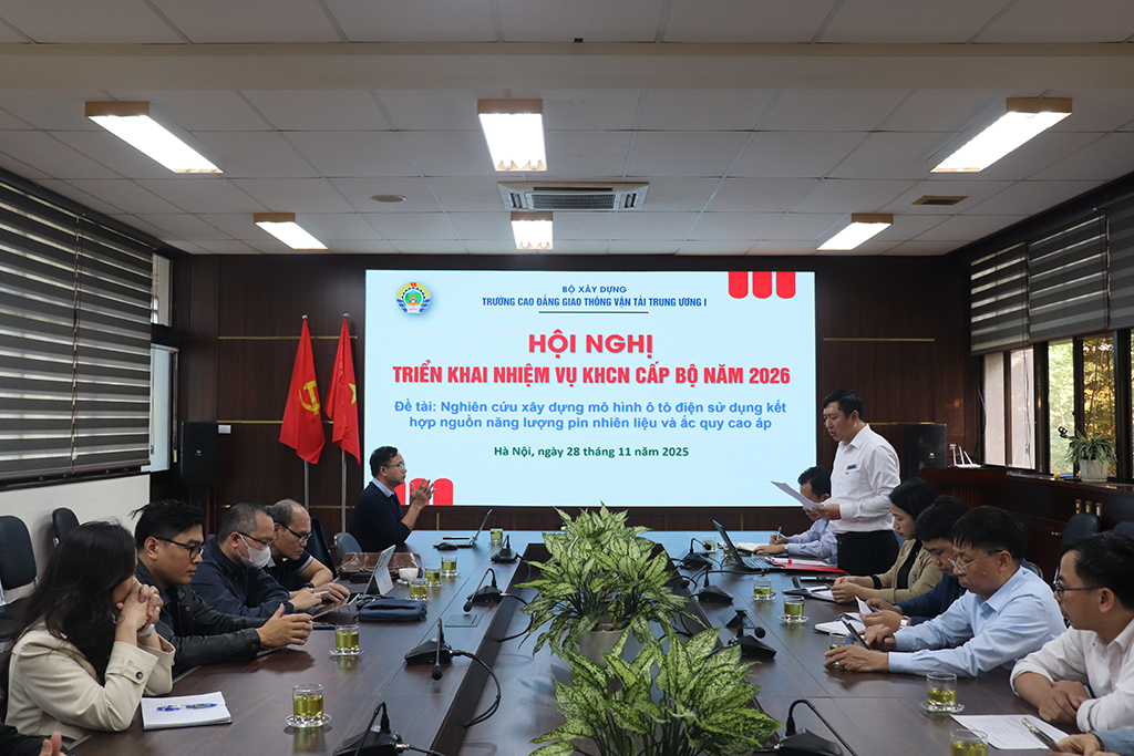 Chiều ngày 28/11/2025, tại Phòng Hội thảo nhà trường, Trường Cao đẳng Giao thông vận tải Trung ương I tổ chức Hội nghị triển khai nhiệm vụ khoa học công nghệ cấp Bộ năm 2026 với đề tài "NGHIÊN CỨU XÂY DỰNG MÔ HÌNH Ô TÔ ĐIỆN SỬ DỤNG KẾT HỢP NGUỒN NĂNG LƯỢNG PIN NHIÊN LIỆU VÀ ẮC QUY CAO ÁP - FCEV". Đây là nhiệm vụ khoa học công nghệ thuộc lĩnh vực đường bộ, được Bộ Xây dựng phê duyệt với tổng kinh phí 1 tỷ 800 triệu đồng, thời gian thực hiện 15 tháng (từ tháng 01/2026 đến tháng 3/2027).